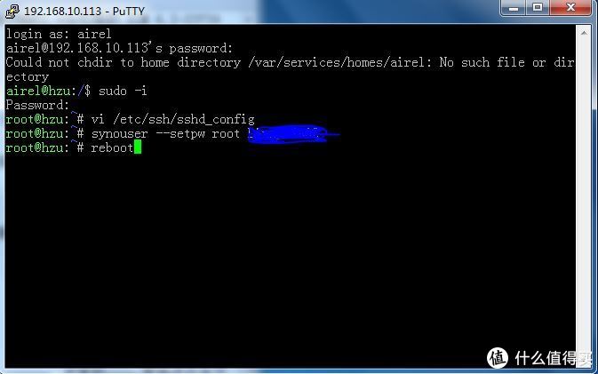 第五:输入 :wq 按回车保存config文件,然后输入synouser --setpw root ###### 对root的密码进行设置(######是你自己要设置的密码字符),按回车后输入reboot命令对NAS重启,这时候root的密码设置完毕,可以使用root用户登陆SSH或者WINSCP了。看到下面的截图就表示修改设置成功。