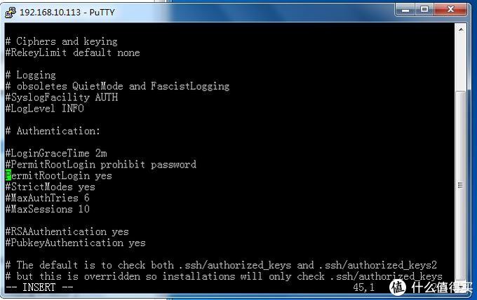 第四:输入 vi /etc/ssh/sshd_config 命令回车,这个时候进入config文件的修改,使用键盘上下按键找到PermitRootLogin yes 字句。输入i 进入编辑模式,输入#PermitRootLogin prohibit password 字句。然后按ESC 退出编辑模式。