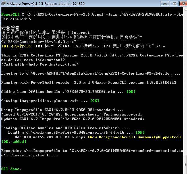 .\ESXi-Customizer-PS-v2.6.0.ps1 -izip .\ESXi670-201905001.zip -pkgDir c:\whsir\注意:打包时会自动在c盘whsir文件夹内查找vib的驱动,生成的ESXI6.7.iso镜像会在c盘根下。