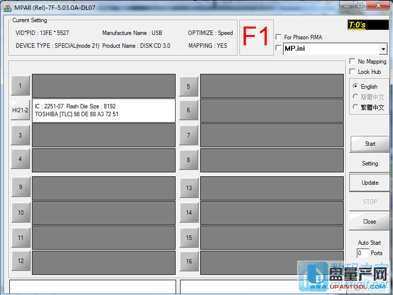 3.打开文件夹中的MPALL_F1_7F00_DL07_v503_0A.exe主程序,点击右侧的update识别优盘