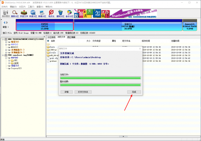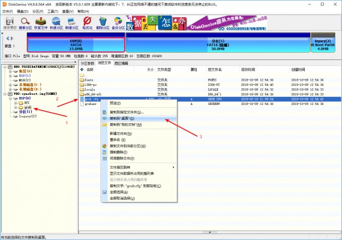 在左边找到刚刚打开的img文件, 点击ESP-grub, 在右边找到grub.cfg, 选择复制到桌面.
