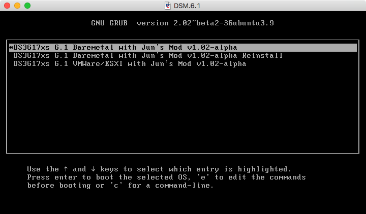 2,默认选择从U盘启动后选择第1个DS3617xs 6.1 Baremetal with Jun's Mod v1.02-alpha按回车。