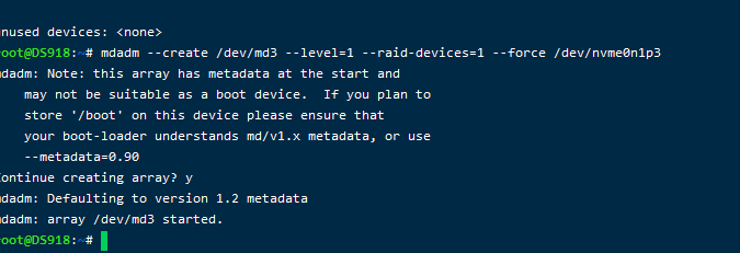 mdadm --create /dev/md3 --level=1 --raid-devices=1 --force /dev/nvme0n1p3需要注意的是:需要在上一步骤显示的储存池数字基础上加1,作为nvme的存储池(所以是md3)